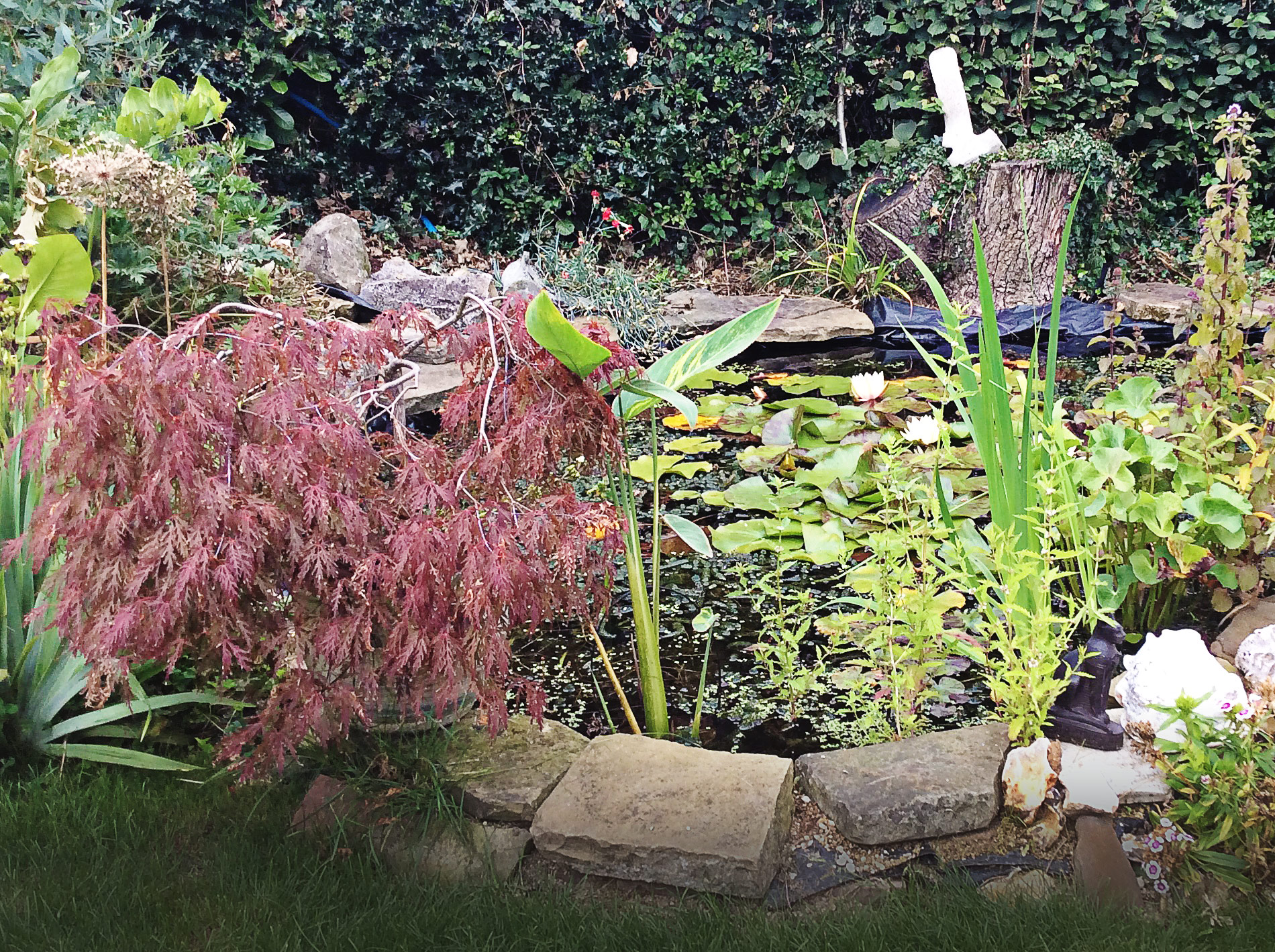 We created this water feature and planted all of the shrubs and flowers, as well as a lustrous new lawn.