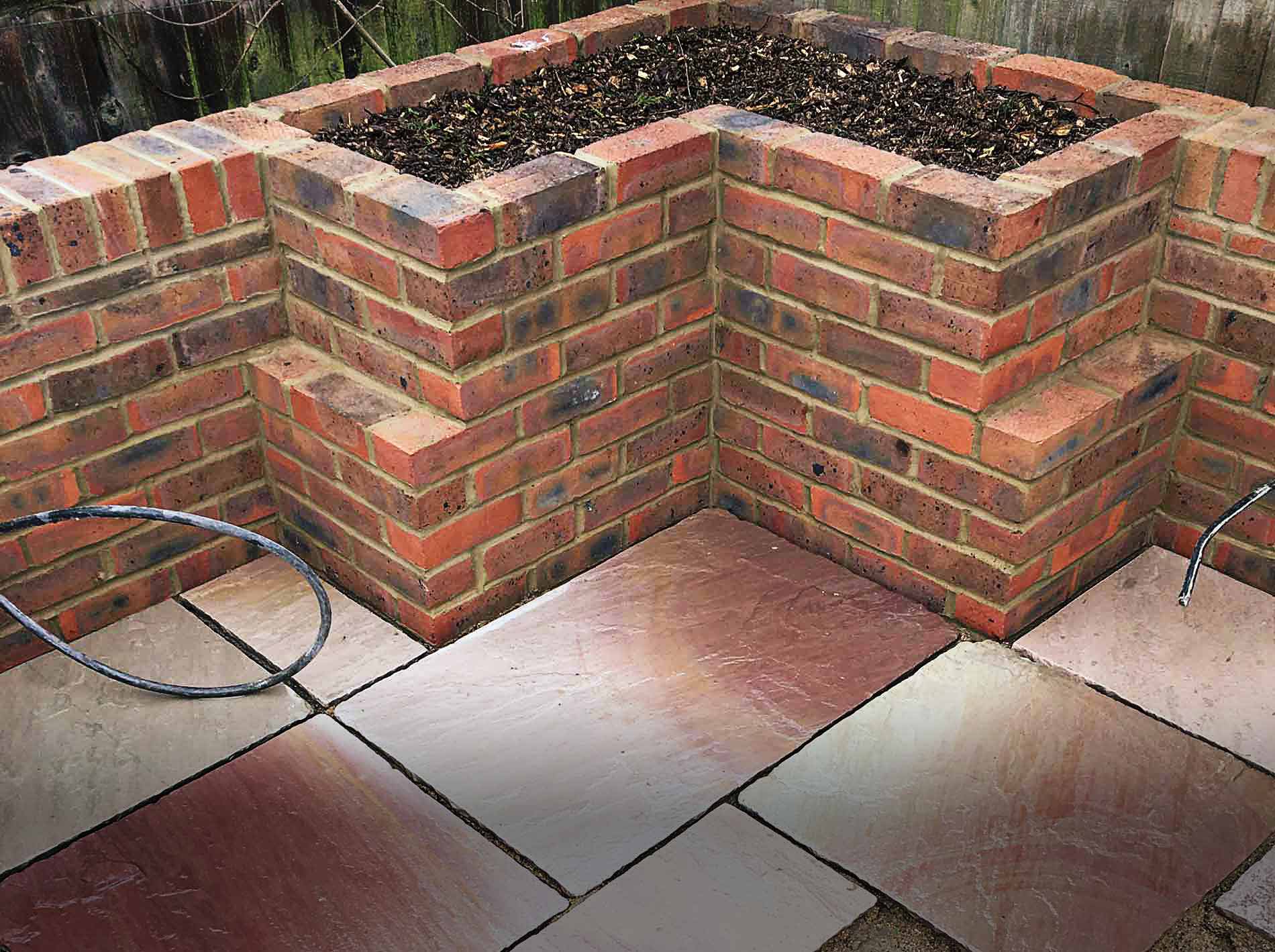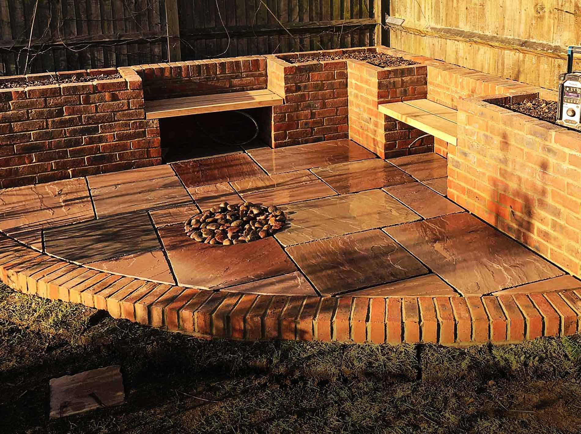 This quadrant was built to measurements drawn up by the owners, transforming a rarely-used patch of lawn into a brickwork seating area with sandstone slabs. We used some leftover variegated pink and grey slabs to lay stepping stones from the nearby pergola.